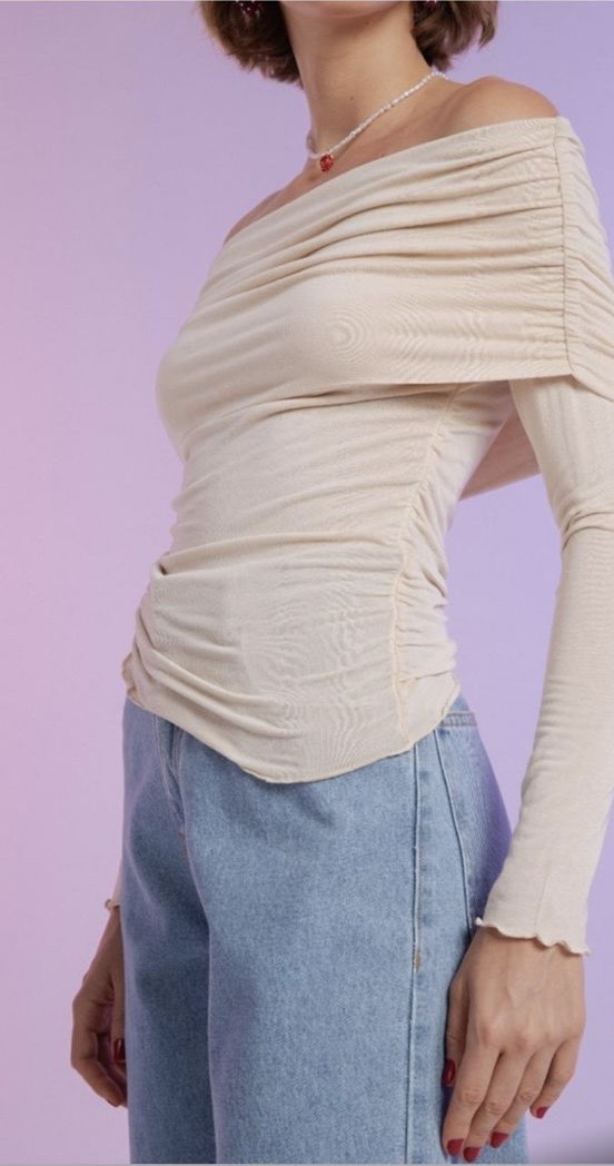 BLUSA OMBRO A OMBRO DE MANGA LONGA E DRAPEADO LATERAL. 96% VISCOSE E 4% ELASTANO.