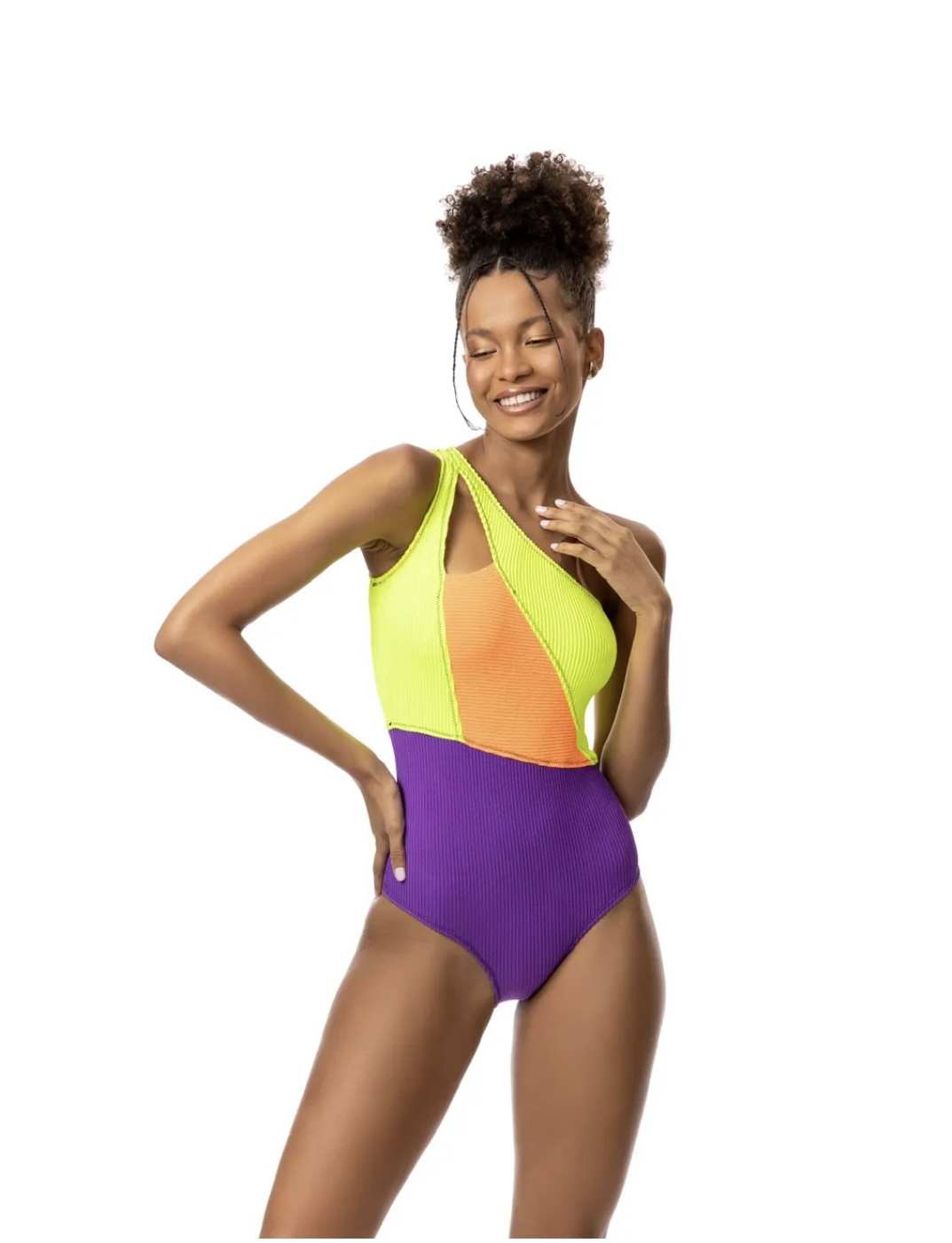 FEITO DE COMBINAÇÕES DE LYCRA TEXTURIZADAS, OMBRO ÚNICO E RECORTE FRONTAL. 88% POLIAMIDA E 12% ELASTANO.