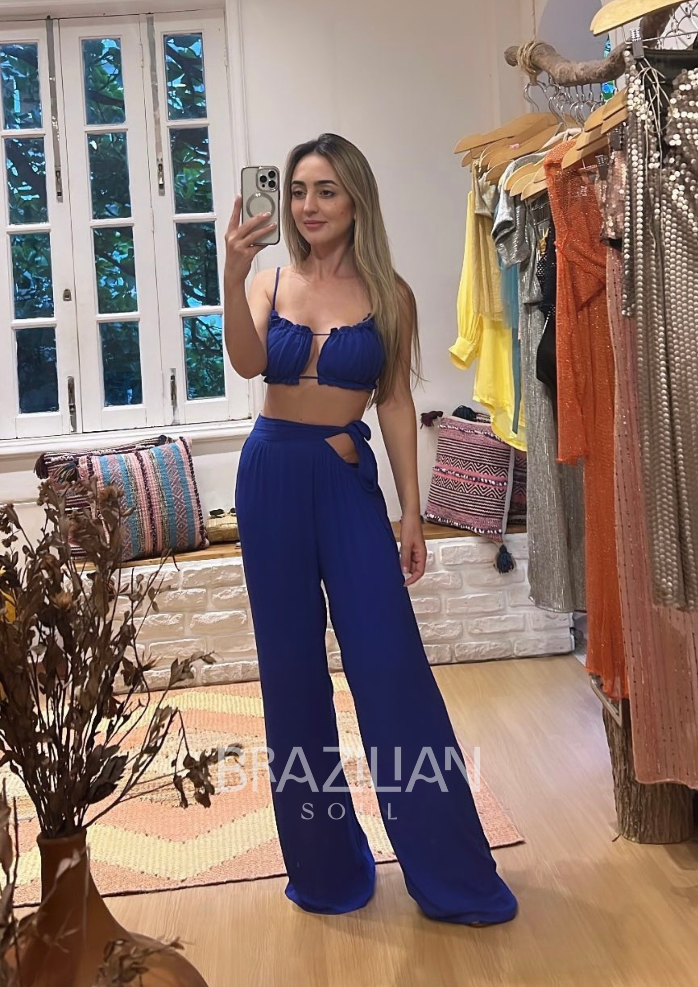 A CALÇA POSSUI UM RECORTE COM AMARRAÇÃO NA PARTE LATERAL. MODELAGEM SOLTINHA. 100% VISCOSE.