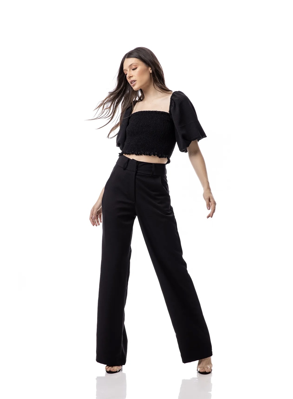 CALÇA ALFAIATARIA PANTALONA DE CINTURA ALTA E BOLSO EMBUTIDO NAS COSTAS. 81% POLIESTER, 15% VISCOSE E 4% ELASTANO.