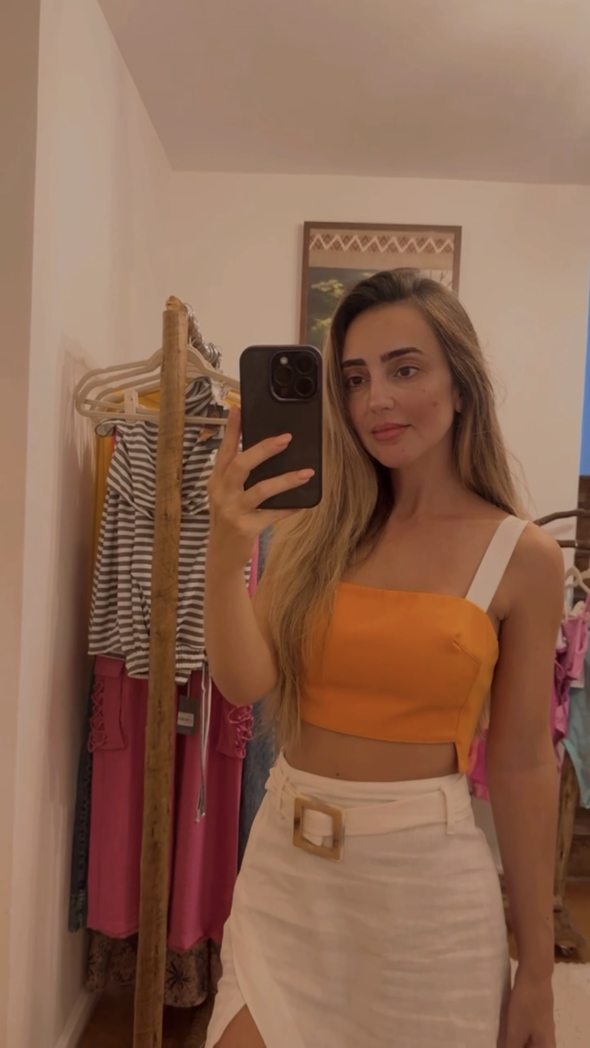 CROPPED BICOLOR COM ALÇA LARGA E AJUSTAVEL, COSTAS COM ELÁSTICO DUPLO E BOTÕES. TECIDO 95% POLIÉSTER E 5% ELASTANO.