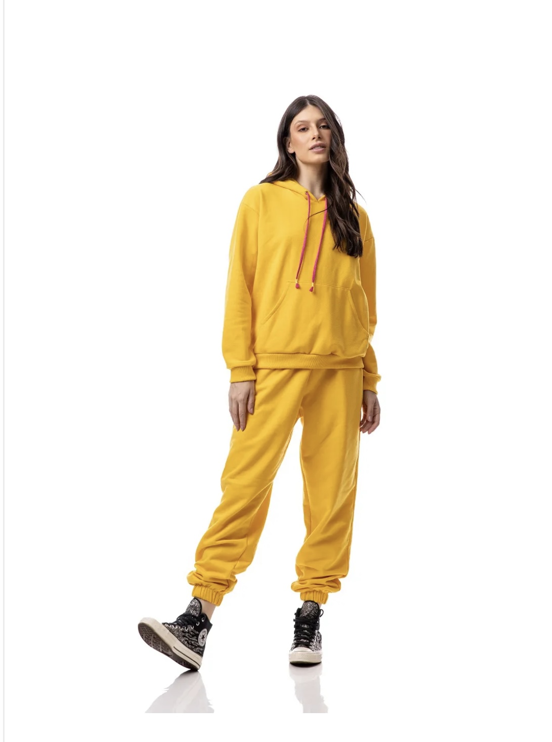 BLUSA DE MODELAGEM SOLTINHA COM BOLSOS NA FRENTE E CAPUZ, POSSUI DETALHE MARAVILHOSO EM TECIDO METALIZADO CORTADO A LASER E APLICADO NAS COSTAS. CALÇA LARGUINHA COM ACABAMENTO EM RIBANA NA BARRA E APLICAÇÃO NOS BOLSOS DAS COSTAS. CONFECCIONADO EM MOLETOM COMPOSTO DE 50% ALGODÃO E 50% POLIÉSTER. RIBANA 49% ALGODÃO, 49% POLIÉSTER E 2% ELASTANO.