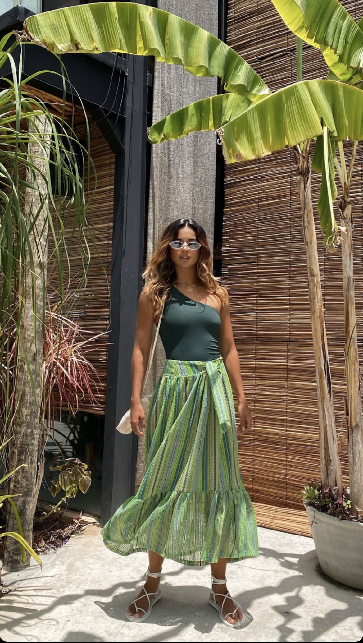 MALHA CROCHET, CINTURA ALTA, AMARRAÇÃO FRONTAL E BABADO NA BARRA. COM CAIMENTO LEVE, TEM COMO COMPOSIÇÃO 100% POLIÉSTER.