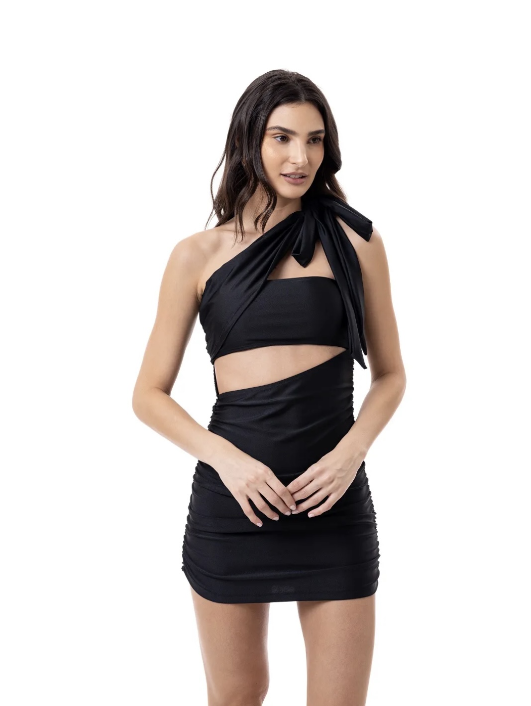 EM COMPIRMENTO MINI COM CORPO FRANZIDO, POSSUI UMA FAIXA NO BUSTO COM UMA TIRA LARGA SOBREPOSTA E TRANSPASSADA NO OMBRO. COMPOSIÇÃO: 87% POLIÉSTER E 13% ELASTANO.